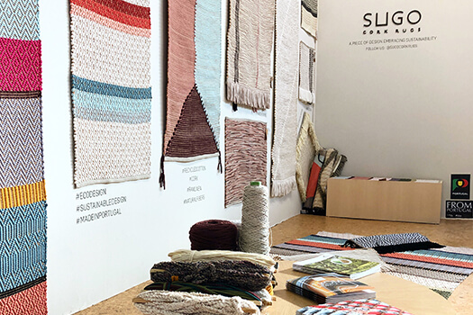 "The handwoven rug requires an innovative cork ribbon along with cotton or wool and raw linen, weaved together by the brand’s artisans in Portugal."